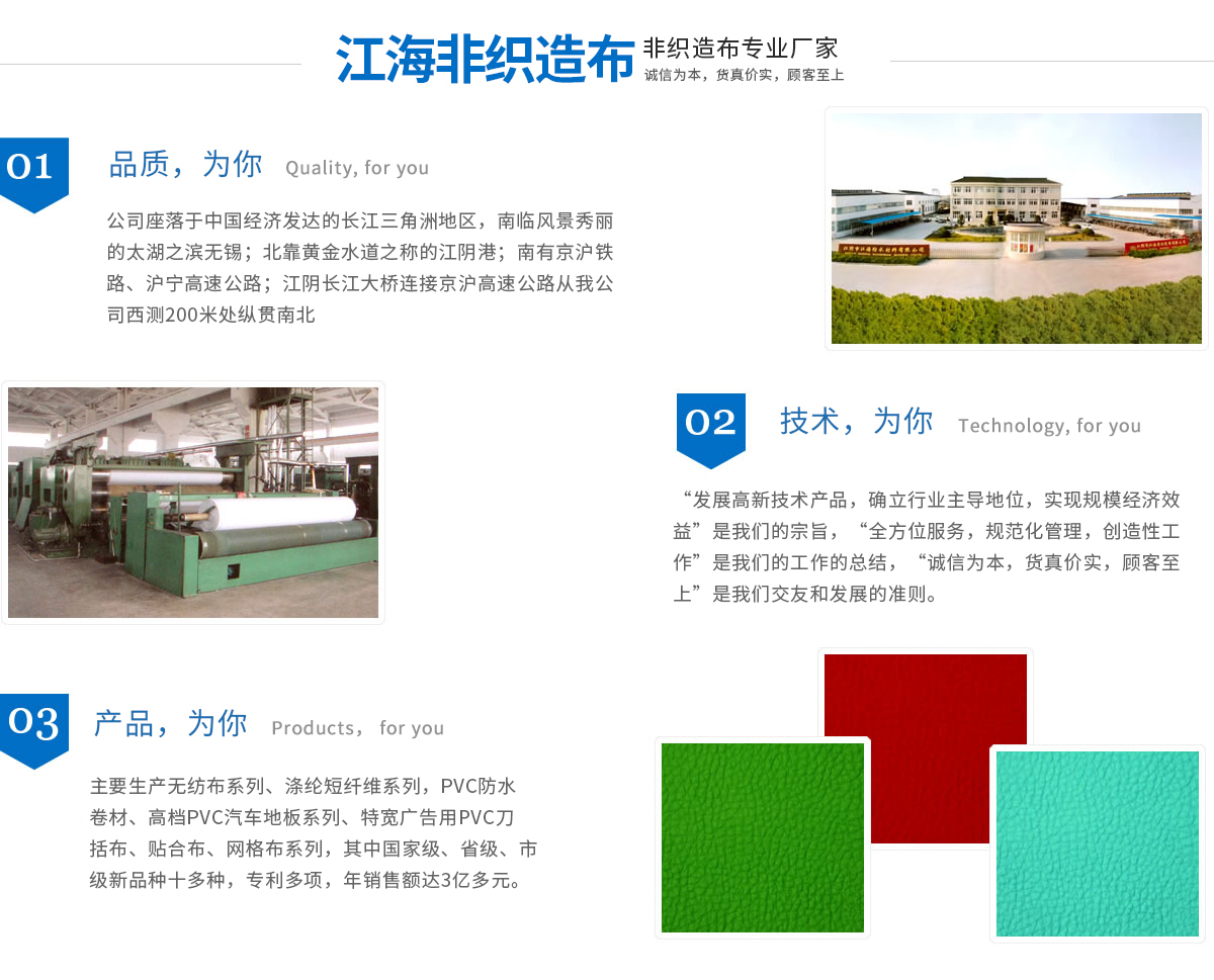 江海企業(yè)有江陰市江海非織造有限公司、江陰市江海防水材料有限公司、江陰市三江寬幅無紡布有限公司、江陰市三江織物涂層新材料有限公司組成,均屬于江蘇省民營科技企業(yè)。企業(yè)現(xiàn)擁有員工近千名,占地15萬平方米,廠房建筑面積達(dá)80000多平方米,凈資產(chǎn)超億元,主要生產(chǎn)無紡布系列、滌綸短纖維系列、PVC防水卷材、高檔PVC汽車地板系列、特寬廣告用PVC刀括布、貼合布、網(wǎng)格布系列,其中國家級(jí)、省級(jí)、市級(jí)新產(chǎn)品十多種,專利多項(xiàng),年銷售額達(dá)3億多元。